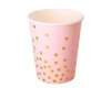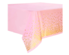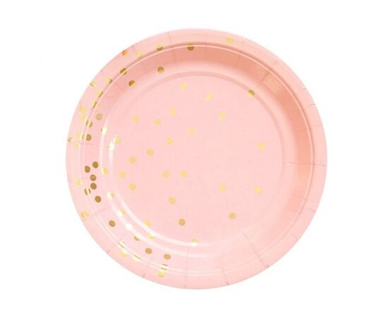 10 roze bordjes, 10 bekers, 10 servetten en 1 tafelkleed met gouden stippen